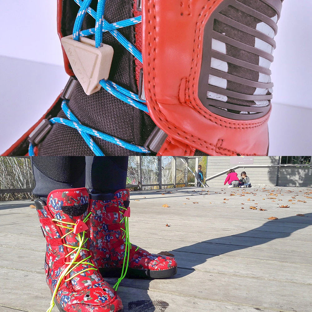 La boucle, fabriquée en France également et qui permet de serrer le lacet est une pièce réalisée en impression 3D sans collage, sans soudure et sans montage qui permet de parfaitement bloquer l’ensemble puisque la pièce est parfaitement usinée avec son mécanisme. Cette boucle est garantie à vie.